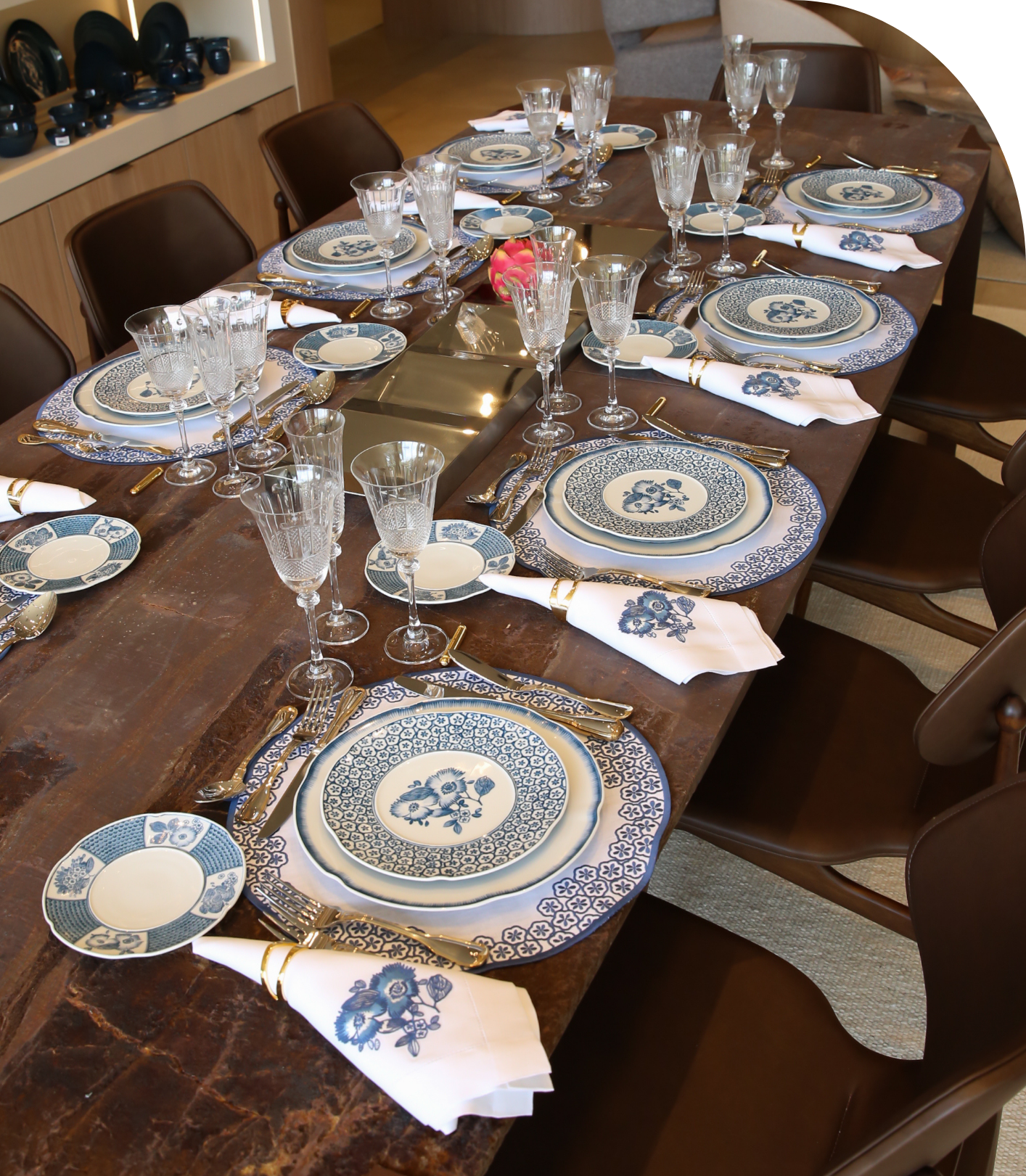 Seja na versão alaranjada, com sua energia vibrante, ou na nova versão azul, com sua elegância tranquila, ela permite composições versáteis: do almoço casual ao jantar especial, da mesa contemporânea à clássica, sempre com um toque de exclusividade e refinamento.